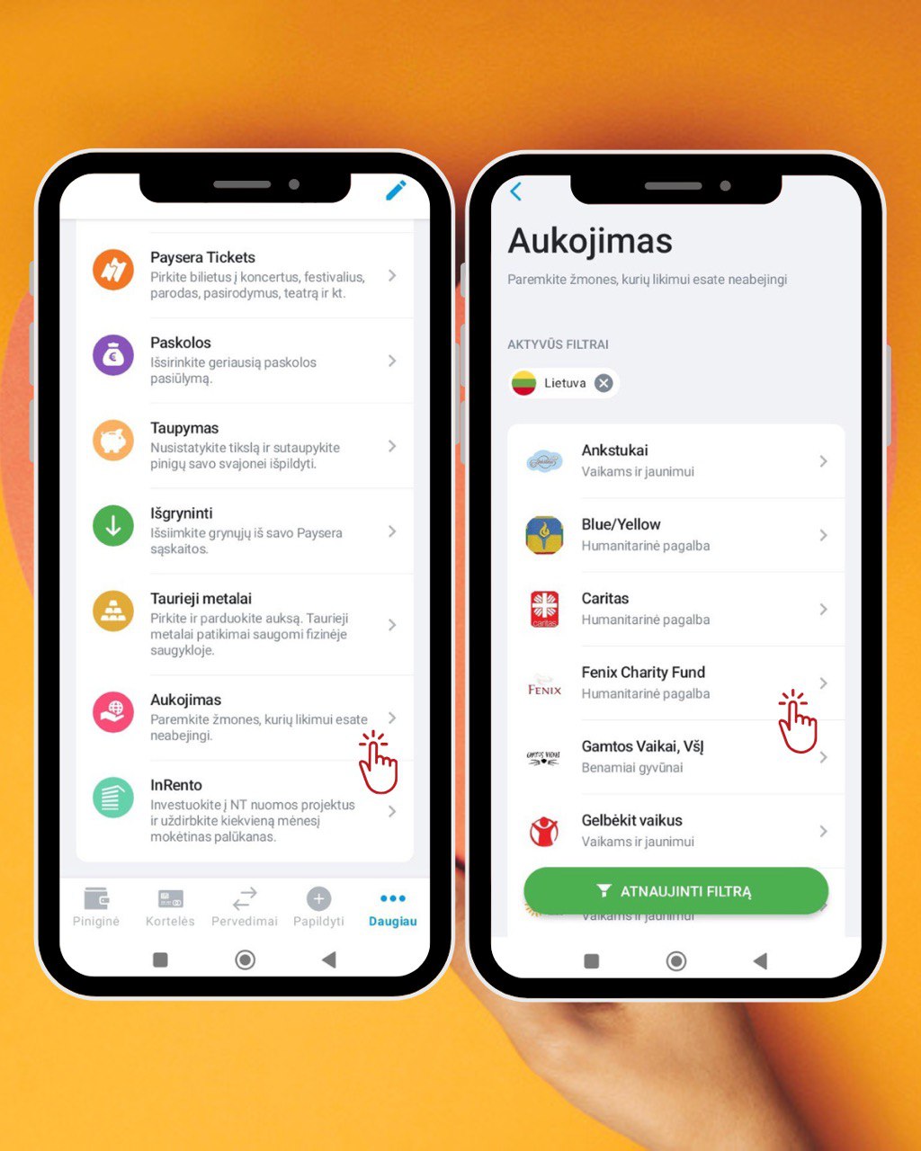 To do this, simply log in to your Paysera app, select More > Donations to Charities, and among the list of organizations, find the Fenix Charity Fund.
